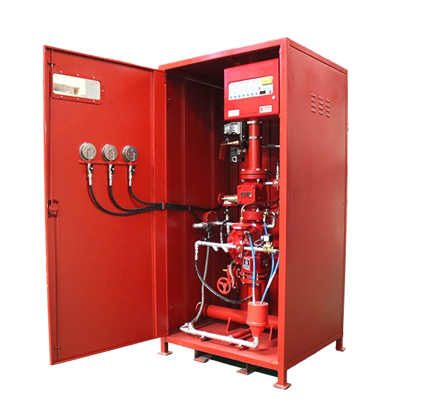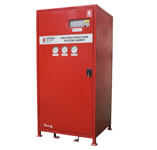 The Pre-piped preaction system cabinet is made of powder-coated steel, combining the reaction valve, compressor, and releasing panel in a single enclosure. Pressure gauges, fire detection, and releasing status are visible even when the cabinet is closed, providing an all-in-one solution for LIFECO Preaction System.